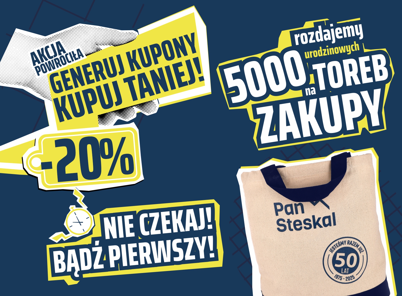 To nie wszystko! Z okazji 50-lecia przygotowaliśmy dla Was coś naprawdę wyjątkowego – unikatowe torby zakupowe. Każda z nich została zaprojektowana specjalnie na tę okazję, a ich liczba jest ograniczona do 5000 sztuk.